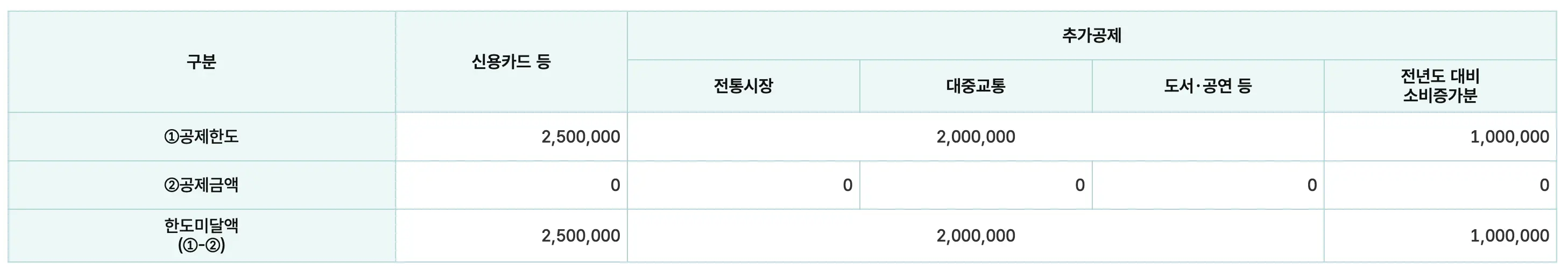| 결제수단 | 소득공제 대상액 | 소득공제액 | 소득공제 합계 |