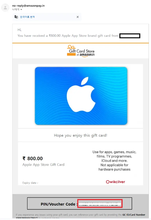 코드는 위 4번에서 기프트카드를 구매할 때 입력한 이메일로 들어가서 확인하시면 됩니다.